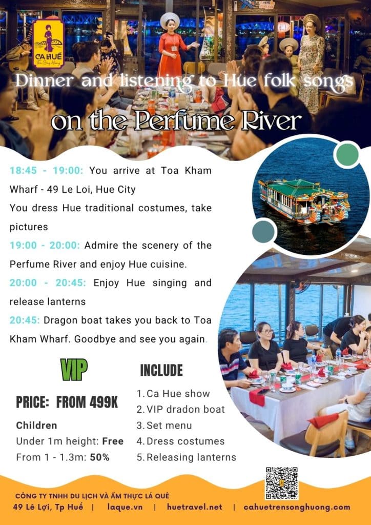 Dinner on the Perfume River is a tour chosen by many small groups of tourists coming to Hue. You will receive many experiences in the tour such as listening to Hue folk songs, releasing lanterns, enjoying Hue cuisine on a dragon boat, watching the Perfume River and Hue city at night.